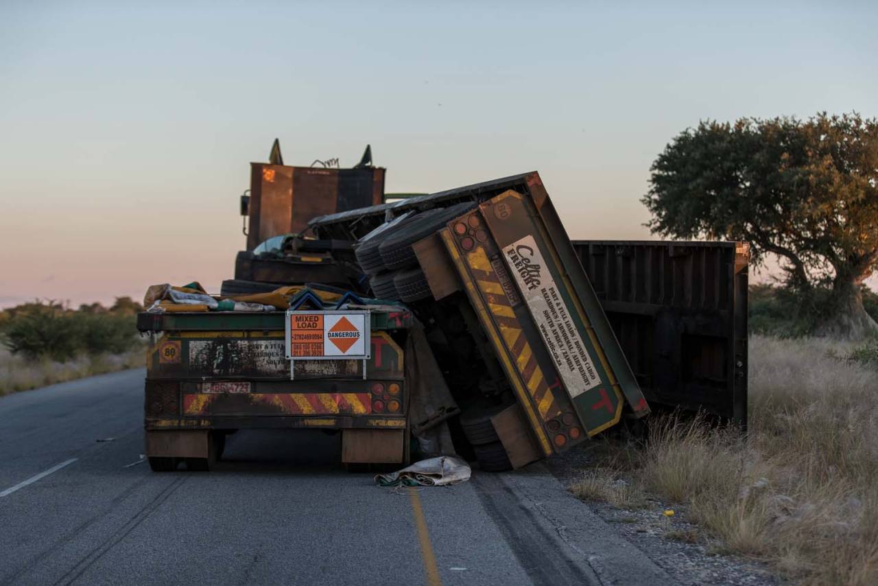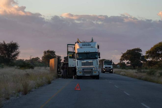 So weit, so normal im Süden Afrikas, wo derartige Missgeschicke fast schon alltäglich sind. Über einen schlecht beleuchteten Havaristen am Straßenrand oder Mängel bei der Ladungssicherung regt sich in Botswana kaum jemand auf. Völlig surreal wird das Bild allerdings beim neugierigen Blick hinter den heruntergefallenen Trailer: Da stehen zwei schwarze Jungs und vertreiben sich die Zeit mit – Gewichtheben. Ein altes Rohr dient als Hantelstange, an der auf jeder Seite vier rostige Zahnräder als Gewichte montiert sind. Eine primitiv zusammengezimmerte Holzbank vervollständigt die Einrichtung des Freiluft-Gyms. Offenbar machen die beiden Trucker – ein Dritter schaut sich das Ganze aus einigen Schritten Entfernung an – das nicht zum ersten Mal, ihre Körper sind mustergültig austrainiert und die Muskelpakete beachtlich. „Ja, wir warten auf den Kran, der den Auflieger wieder auf den anderen Trailer hebt,“ bestätigen sie mit einem Gesichtsausdruck der deutlich macht, dass es einerseits dauern kann, bis hier im Norden Botswanas ein geeigneter Mobilkran aufgetrieben ist, was sicher auch daran liegen könnte, dass erst geklärt werden muss, wer die Bergung wann bezahlt. Und dass sie andererseits gewohnt sind, auf irgendetwas zu warten. Auf die Ladung, auf den Zöllner, auf einen besseren Job, vielleicht auf ein besseres Leben oder eine andere Frau, die ihre Muskeln bewundert und möglicherweise sogar ein wenig mehr. Eine massive Kette liegt auf der Straße, der Gaskocher steht zwischen den Zwillingsreifen, Kochgeschirr, Küchenutensilien und Nahrungsmittel verteilen sich irgendwo auf Trittstufen und dem typischen Ami-Tank und wer aus Europa kommt und eine ungefähre Ahnung davon hat, wie Ladungssicherung einigermaßen sicher funktioniert, sollte nicht auf die beiden schmalen Gurte mit den vielen Knoten schauen, mit denen der alte Truck auf der Ladefläche des intakten Trailers verzurrt ist.