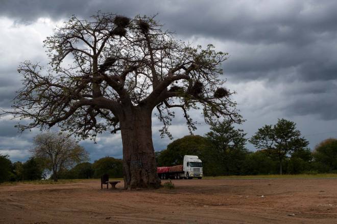 Keine Frage, wer als Lastwagenfahrer in Afrika unterwegs ist, muss die Geduld aufbringen, warten zu können. Ungefähr 260 Kilometer nördlich der Stelle, an der die Gewichtheber auf der A 33 gestrandet sind, stoßen die vier Länder Botswana, Namibia, Zimbabwe und Sambia unweit der Stadt Kasane zusammen. Die Gegend ist ein Traum für Touristen, die Grenze ein Alptraum für die Fahrer, die hier oft drei Wochen lang im Stau stehen, ehe sie abgefertigt werden und weiterfahren können. Das Problem: Seit Jahrzehnten diskutieren die Anrainer einen Plan, die Abfertigung mit einer Brücke über den Sambesi-Fluss zu beschleunigen. Doch momentan stellt sich der greise Diktator Robert Mugabe quer. Der Kleptokrat, der das prinzipiell reiche Land Zimbabwe als persönliche Beute betrachtet und zu einem weiteren afrikanischen Armenhaus heruntergewirtschaftet hat, blockiert den Brückenbau, den die drei anderen Länder ohne ihn realisieren wollten. Angeblich, erzählen einige Fahrer, weil die Brücke den „Luftraum“ Zimbabwes tangiert (der allerdings nicht genau festgeschrieben ist), wofür Mugabe Geld haben will. Also werden die Trucker weiterhin beiderseits der Grenzen stehen, tage- oder wochenlang, dort ihre Wäsche waschen und am Scheibenwischer des Lkw aufhängen, sich von den Einheimischen einfache Nahrungsmittel oder stundenweise Zuneigung kaufen und vielleicht froh sein, dass sie wenigstens einen Job haben, der je nach Arbeitgeber besser oder schlechter bezahlt wird.
