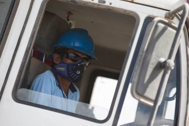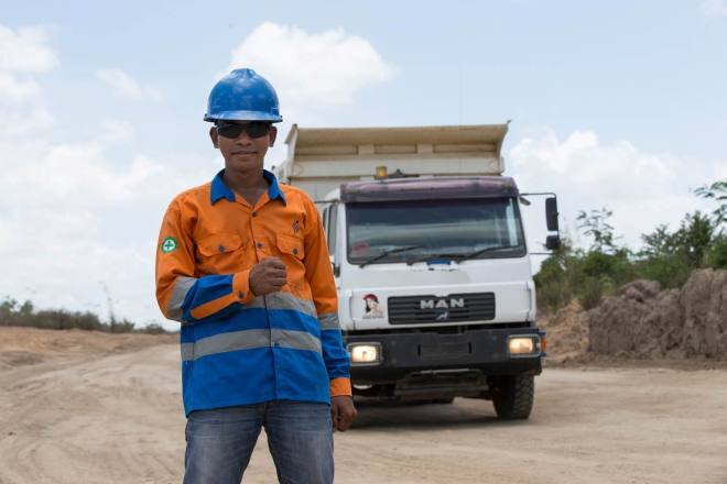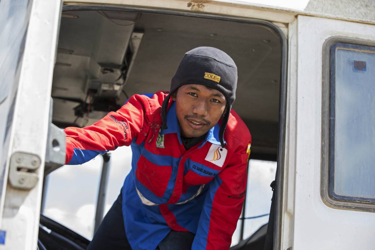 Die Fahrer haben die Fenster ihrer schmalen Kabinen meist auf Durchzug gestellt, es bleibt ihnen ja nicht viel übrig angesichts der tropischen Klimabedingungen. Temperaturen um die 35 Grad und extrem hohe Luftfeuchtigkeit sind in dieser Region üblich. Weil der Staub beim Fahren durch die offenen Fenster zieht, schützen sich viele der Trucker während ihrer Schicht mit Staubmasken. Insgesamt hat SBM in der Mine 25 Fahrer im Einsatz, die alle zu einem Fahrertraining geschickt wurden, „ehe sie auch nur einen Meter gefahren sind“ (Wayan ...) Bei einigen könnte man allerdings vermuten, das Fahrertraining habe unter der Leitung eines Dakar-Racers stattgefunden. Aber am Monatsende gehen die Trucker allesamt als Millionäre nach Hause: Weil die indonesische Rupiah über die Jahre viel an Wert eingebüßt hat, bemisst sich das monatliche Salär in Millionen. Rund vier Millionen Rupiahs sind das übliche Gehalt, umgerechnet rund 270 Euro.