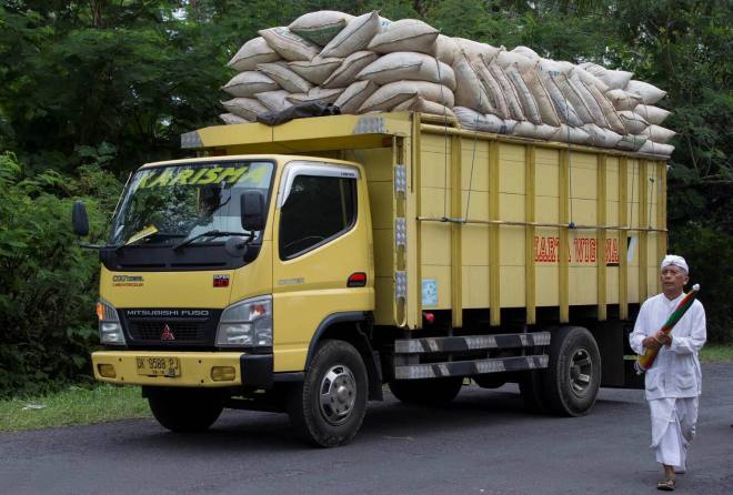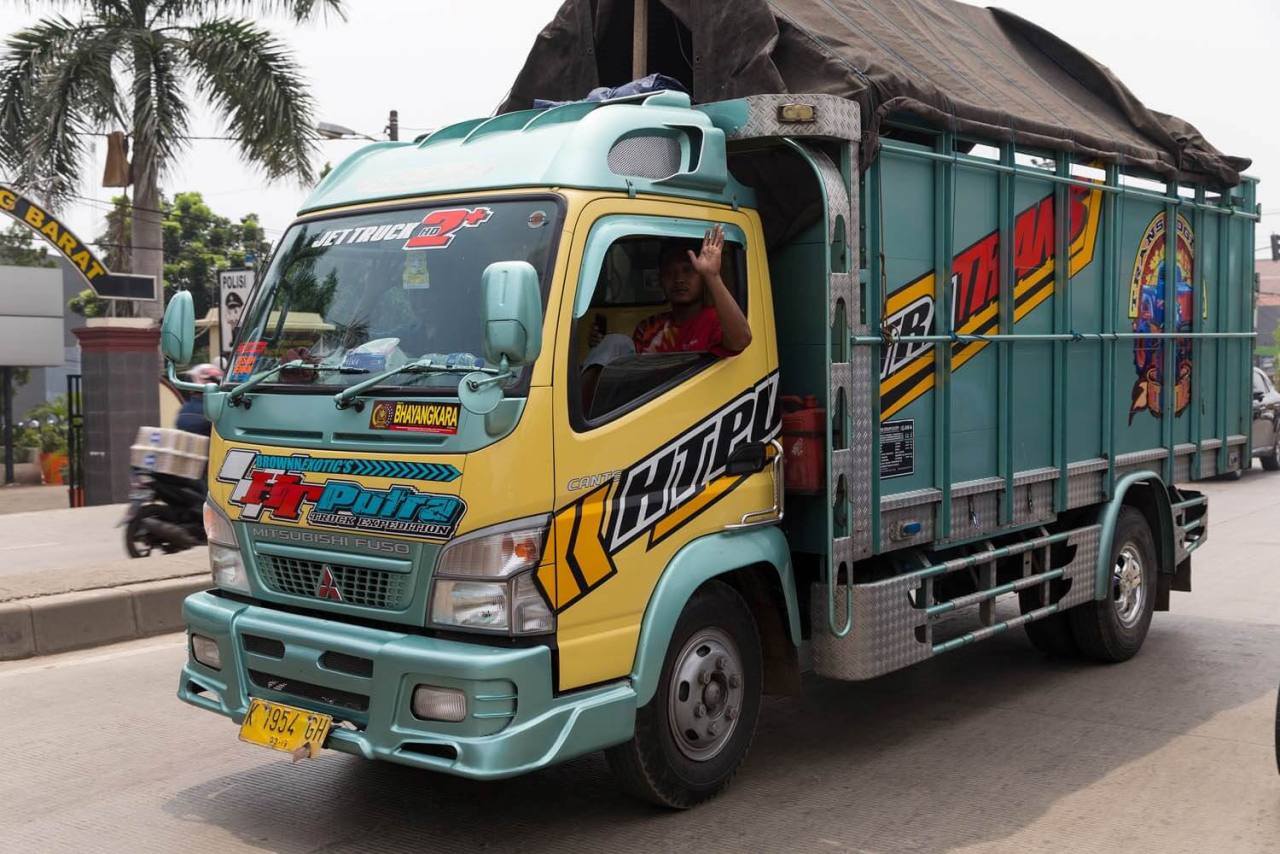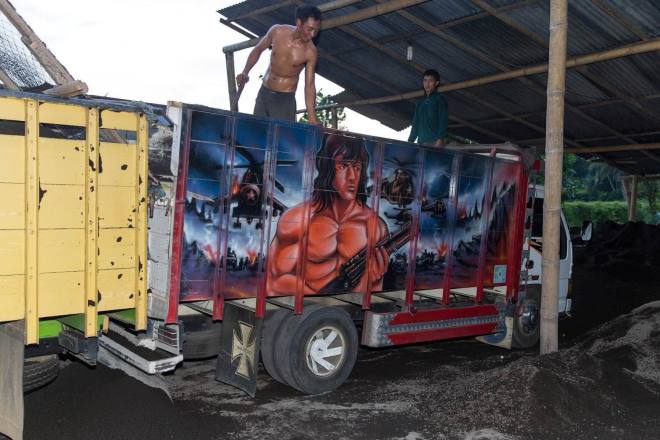 Inzwischen hat der Meister der gesprühten Farbenpracht Konkurrenz bekommen, auch in Indonesien verbreitet sich die Variante Folienbeklebung immer weiter. „Einige wollen Folien, andere stehen auf Airbrush. Aber glücklicherweise habe ich viele loyale Kunden, die immer wieder kommen,“ sagt der Mann, der aus Zentral-Java stammt und seinen Beruf mit der Souveränität von 25 Jahren Erfahrung ausübt. Auf der Touristeninsel Bali arbeitet einer, der verrückt ist nach Motiven, wie sie Jamariim schnelldurchgang auf die Bordwände pinselt. Helfer schaufeln gerade Sand von der Ladefläche eines Isuzu, der angeblich mit knapp fünf Tonnen beladen werden darf – die nasse Ladung wiegt mit Sicherheit mehr. Sein Besitzer hat offenbar Freude an kräftigen Farben: Auf einem seiner Isuzus jagt ein fröhlicher Tom dem ebenso fröhlichen Jerry hinterher. Auf dem zweiten Truck prangt ein Motiv, das eigentlich auch ganz gut zur allgemeinen Fahrweise in Indonesien passen würde, die man über weite Strecken durchaus als Straßenkampf bezeichnen könnte. Aber Rambo nahm damals ja die bösen Kommunisten aufs Korn, nicht den Nebenmann an der Verkehrsampel.