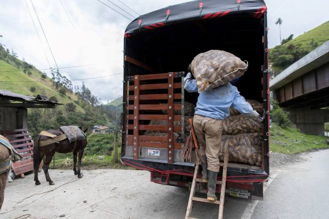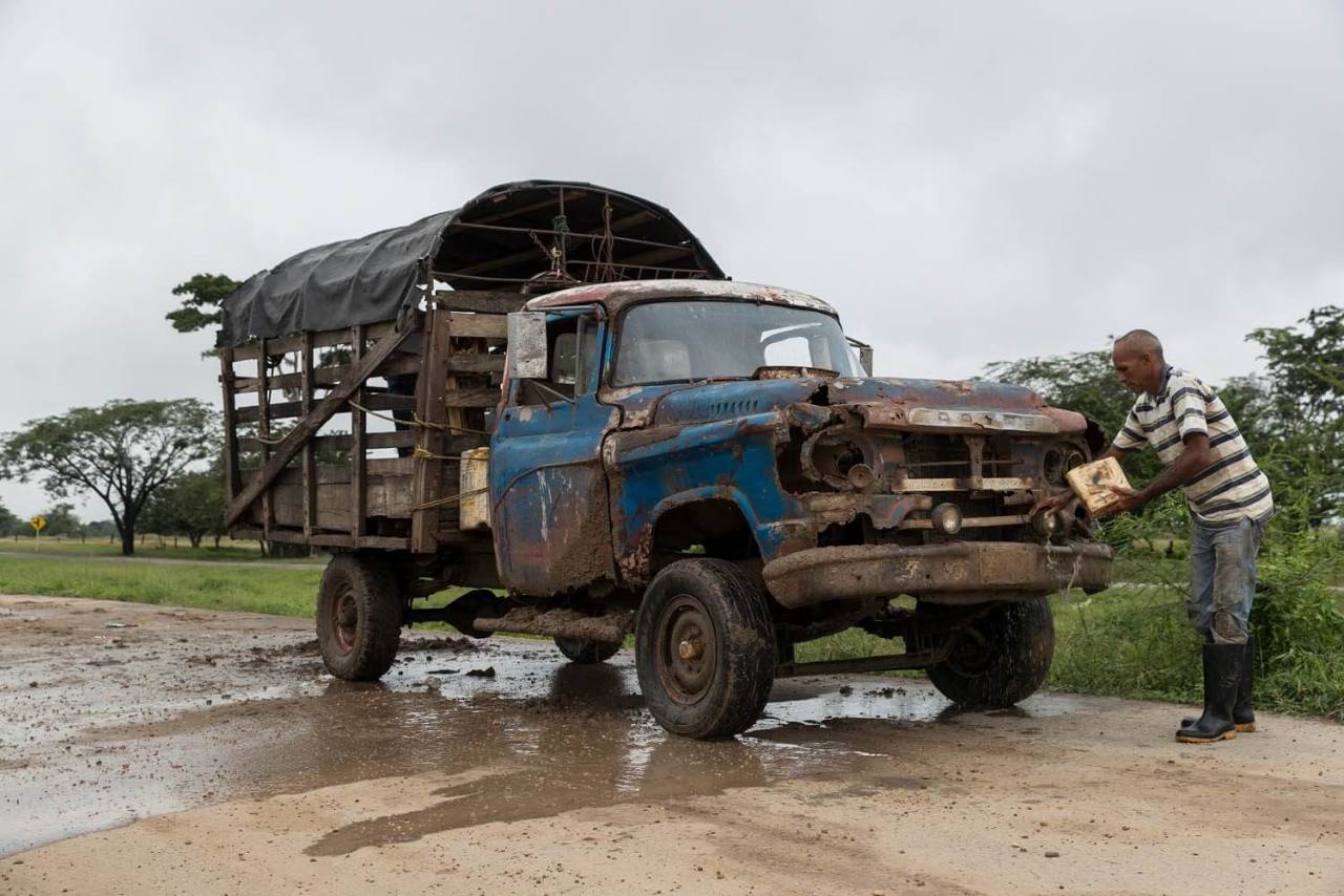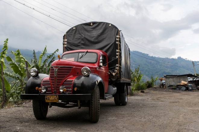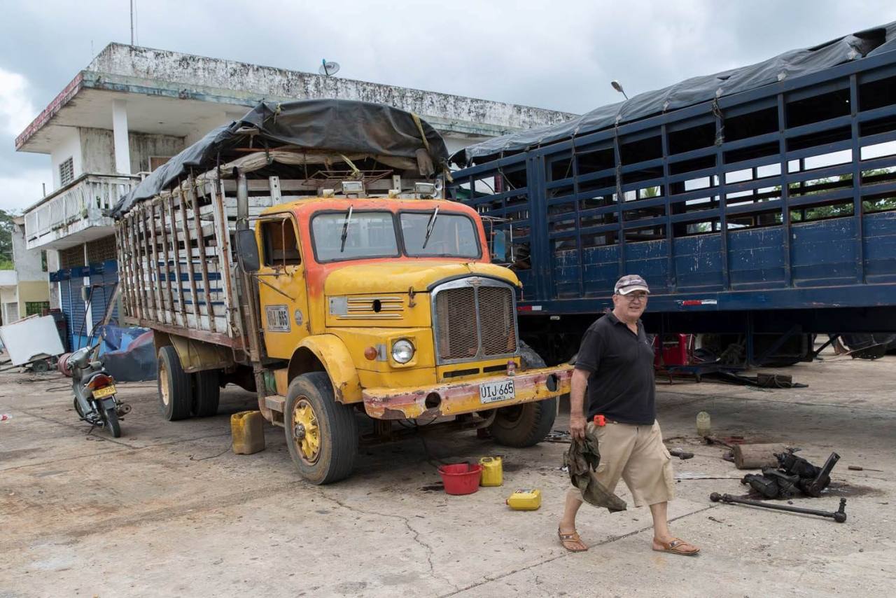 Mag sein, dass man nicht über Leute wie den Autowäscher an der Autopista 25 urteilen sollte, ohne ihn näher zu kennen. Aber einen glücklichen Eindruck macht der halbnackte Mann sicher nicht. Er wäscht für ein paar Pesos Autos und Trucks, das Wasser zapft er aus dem Bergbach, der sich wenige Meter neben der Straße über eine Kaskade in die Tiefe stürzt und dort ein Becken füllt, in das der Lavadero seine Pumpe gehängt hat. Er lebt hier, in einer Art Höhle neben der Fahrbahn. Seine Frau liegt in der Hängematte und verdämmert den Tag oder blinzelt hinüber zu ihrem Mann, wenn der einen der seltenen Kunden bedient. Die Kunden wiederum stehen deutlich höher in der gesellschaftlichen Hierarchie: Wer Arbeit als Trucker findet, hat zwar einen harten Job, kommt aber üblicherweise gut zurecht. Wobei man das Fahrzeug nicht als Maßstab für die Qualität des Berufs nehmen darf – auch mit einem Oldtimer lässt sich in Kolumbien noch gutes Geld verdienen. Der Besitzer eines schwarzen Mack-Haubers, der 1978 zusammengeschraubt wurde, meint zum Beispiel, vor einigen Jahren seien die Geschäfte schlecht gegangen, jetzt laufe es dagegen wieder prächtig und sein Laster sei trotz seines Alters bestens in Form. Sein Kollege Juan stößt in das gleiche Horn: „Der ist wenigstens schon bezahlt,“ lacht der Fahrer des Vehikels, das als Verkaufstruck über die Berge schnauft und bei jedem Stopp nach einem kräftigen Schluck Wasser verlangt. Zusammen mit seinem Beifahrer Darwin hat Juan den Oldie bis unter das Dach mit Säcken voller Maiskolben beladen, wie viele Tonnen der betagte Motor bewegen muss, mag man gar nicht wissen. Angeblich ist der Chevrolet Baujahr 1950. Vor über 20 Jahren, erzählt der Fahrer, sei der Motor gründlich überholt worden. Auch die Motorhaube des ehemaligen Busses scheint nicht original zu sein, sondern von einem jüngeren Modell zu stammen. Geschenkt, ein Nutzfahrzeug sollte in erster Linie funktionieren, nicht schön sein oder gar „originalgetreu“.