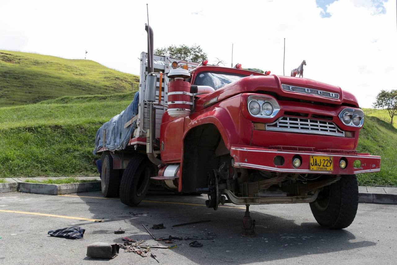 Schuld daran ist neben schlechtem technischen Zustand die generell anarchische Fahrweise, wobei sich die Busfahrer als besonders wahnwitzig hervortun. Man sieht jede Menge geschrottete Pkw, umgestürzte Lastwagen und immer wieder demolierte oder sogar ausgebrannte Busse. Und dann ist da noch dieser alte „Food“ (auf der Haube wurde das R mit einem O ersetzt), der aufgebockt vor einer der vielen Mautstationen steht. Der rechte Vorderreifen ist abmontiert und lässt einen Blick auf die armseligen Bremsbeläge zu, die teilweise völlig zerbröselt beziehungsweise nicht mehr vorhanden sind. „Das Radlager ist kaputt. Die Beläge sind kein Problem,“ meint der dunkelhäutige Mann, der bei dem Truck steht und angeblich nur der Mechaniker ist. „Die halten noch lange.“ Viele Lateinamerikaner bekreuzigen sich im Flugzeug vor dem Start – vielleicht sollte man das in Kolumbien auch tun, bevor man sich hinter das Lenkrad klemmt.