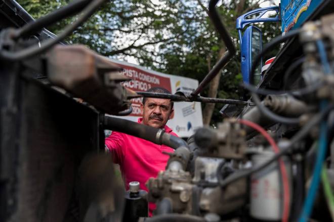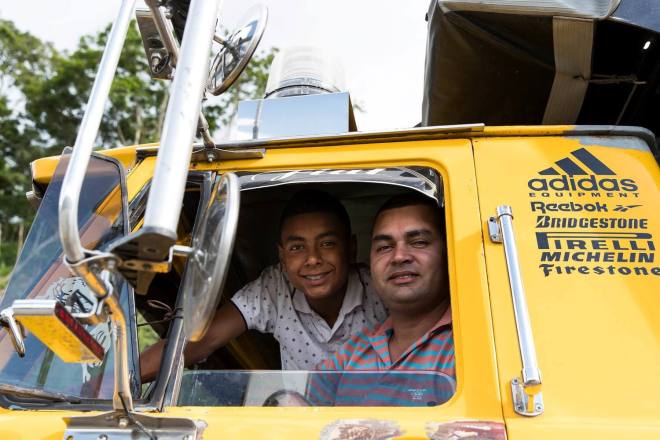 Das Thema Wartungsintervalle bekommt angesichts des Alters der Lastwagen und der anspruchsvollen Topographie eine ganz andere Bedeutung. Am Wochenende muss noch geschmiert werden, für viele Fahrer vergeht zudem selten eine ganze Woche, in der sie sich nicht um die Technik ihrer Trucks kümmern müssen. Auch José Florez bereitet zusammen mit seinem Sohn an einem Sonntag den alten CAT-Motor im Kenworth – Baujahr 1984 – für die kommende Woche vor. Der zehnjährige José-Jeffrey ist begeistert bei der Sache, wann immer es geht, begleitet er seinen Papa auf Tour. Der Kenny, der einem patrongehört, zieht einen Kippauflieger in einer für Kolumbien typischen Konfiguration: Die Mulde ist zweigeteilt und im vorderen Bereich als Seitenkipper ausgeführt. Die rückwärtige Hälfte kippt dagegen nach hinten ab. 350 Kilometer sei die durchschnittliche tägliche Fahrtstrecke, sagt José Florez. Bezahlt werde mit einem Festgehalt und Prämien je nach gefahrener Strecke. Dass die Frau oder die Kinder mit im Truck sitzen, ist in Kolumbien keine Seltenheit. Auch Andres hat seinen Sohn dabei. Vater und Filius sitzen in einem der gedrungenen Kipper, ebenso wie der Mack ein Oldtimer: Der Fiat 673 N aus dem Jahr 1980 macht noch einen fitten Eindruck, von dem Baumuster sieht man ganz allgemein noch viele Exemplare auf den Straßen des lateinamerikanischen Landes. Weniger gut schaut dagegen der Dodge von Kewin aus, der von seiner schwangeren Frau begleitet wird. Eine fidele Truppe belädt den vierzig Jahre alten Zweiachser mit zusammengeschweißten Eisenteilen – hoffentlich hören sie damit auf, bevor es dem Veteranen, mit dem Kewin über die Berge in Richtung Bogota fahren wird, zu viel wird.