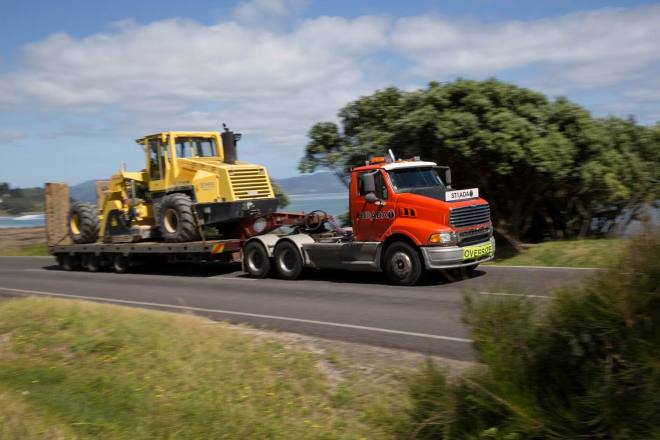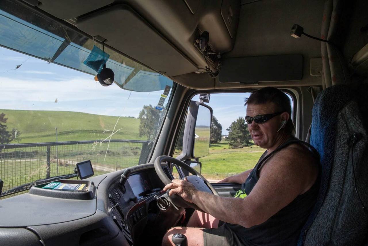 Dort lädt mich Grant, der Fahrer des FH, ein, mit ihm zum Abladen zu fahren. Die Zigarette hängt im Mundwinkel, der Mann sieht aus wie ein typisch neuseeländischer Trucker im Sommeroutfit eben aussieht: Mit breitem Kreuz, cooler Sonnenbrille, verstaubtem Muskelshirt und kurzer Hose. „Ich bin der Boss,“ lacht Grant und erklärt, dass er eigentlich nicht selber fahre. Aber heute sei der Mitarbeiter, der üblicherweise auf dem Vierachser sitze, krank geworden, da sei er eben selber eingesprungen. Auf seine alten Allrad-Volvos lässt der Unternehmer nichts kommen: „Die machen immer noch einen erstklassigen Job. Und du hast ja selber gesehen, dass der Vierachser auf dem Feld an seine Grenzen gekommen ist. Auch wenn sich die neuen Trucks natürlich viel schöner fahren lassen.“