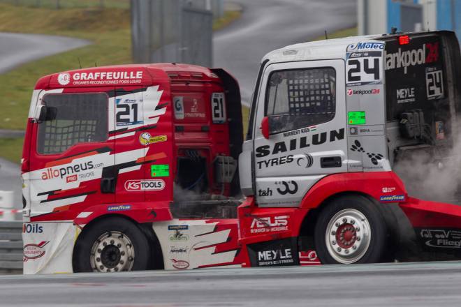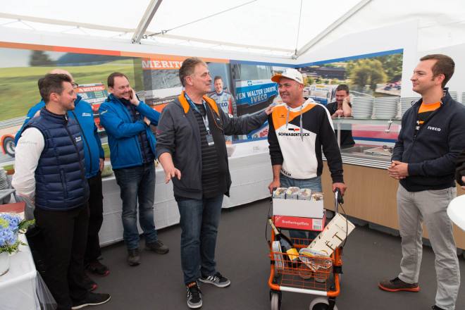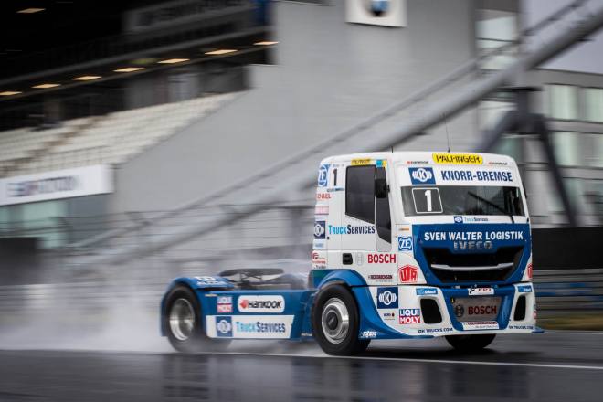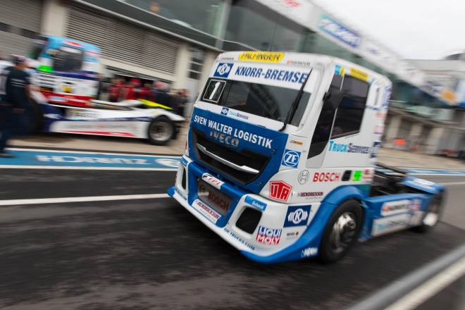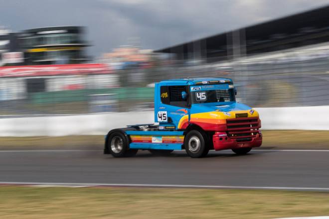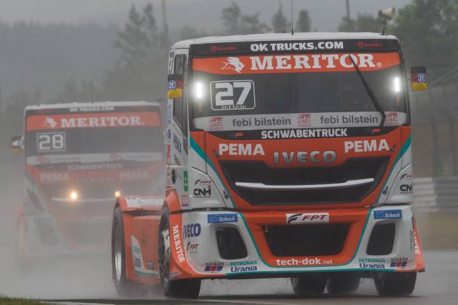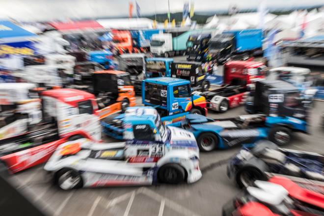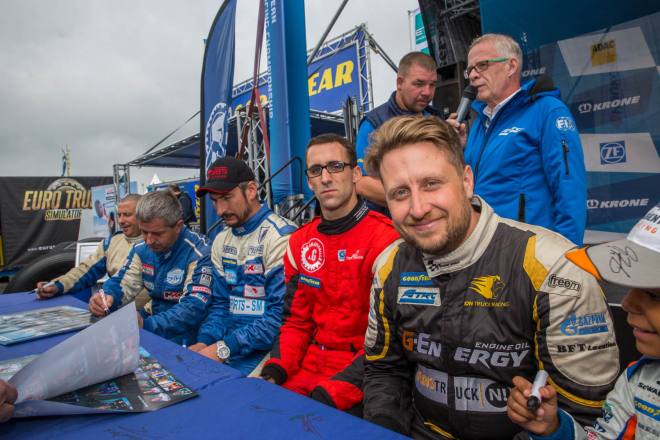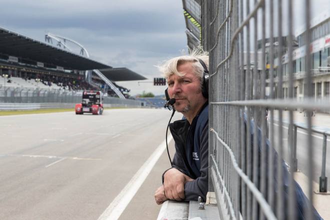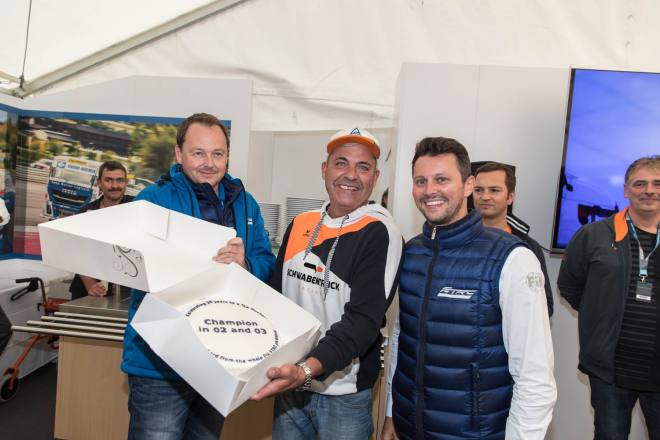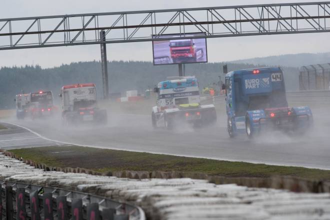Im Gegensatz dazu stand nach den drei Championshiprennen der FIA-Starter immer derselbe Akteur ganz oben auf dem Siegertreppchen. Adam Lacko ließ es richtig krachen und dem Rest des Feldes nicht den Hauch einer Chance. Der Tscheche hat momentan offenbar einen guten Lauf. Nachdem er den Auftakt in Österreich einigermaßen „vergeigt“ hatte, präsentierte er sich schon in Misano in Topform, holte sich dort 58 von 60 möglichen Punkten und am Nürburgring 50 von 50 möglichen. Jochen Hahn und Steffi Halm – im Gesamtklassement die Verfolger von Spitzenreiter Lacko – bleiben deutlich hinter ihren Erwartungen zurück. Auch Norbert Kiss, am Sonntag Pole-Setter und Antonio Albacete, der diesmal viel Pech hatte, konnten Lacko nicht bremsen. Hahn schob sein „schlechtes“ Abschneiden (schlecht ist in diesem Zusammenhang relativ – andere Fahrer wären froh, Hahns Resultate einzufahren, aber für einen vierfachen Champion gelten eben andere Maßstäbe) auf das Wetter. Bei Regen sei sein neu aufgebauter Iveco sicher nicht das Maß der Dinge, erklärte der Schwarzwälder. Und der Dauerregen spielte auch bei Steffi Halm die entscheidende Rolle. Sie gibt freimütig zu, dass sie sich auf nasser Fahrbahn nicht besonders wohl fühlt, was ebenfalls relativ zu sehen ist: Die einzige Frau im Starterfeld mischt bei derartigen Verhältnissen dann eben nicht in den Top 3 mit, sondern steht als Siebte, Fünfte und Sechste in den Ergebnislisten. Gerd Körber ist immer noch in der "Findungsphase". Sein neuer Truck wurde ja von Jochen Jahn konzipiert, Körpers Team Schwabentruck und Hahn machten beim Bau der Fahrzeuge gemeinsame Sache. "Die Trucks von Jochen sind sicher super," sagte Körper, der in diesem Jahr e30 Jahre lang dabei ist und daher am Freitagabend mit einer Überraschungsparty gefeiert wurde. "Aber das Fahrwerk ist ganz anders, als ich das gewohnt bin. Manchmal fühle ich mich da noch richtig unsicher. Ich muss mich erst daran gewöhnen, das geht eben nicht nach einem oder zwei Rennen."