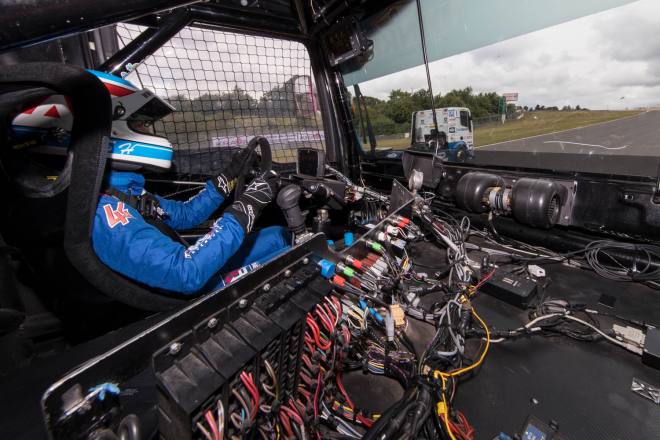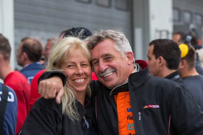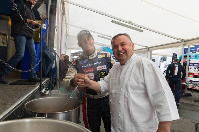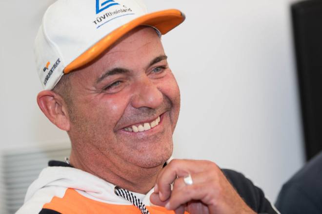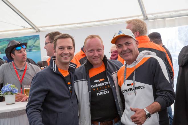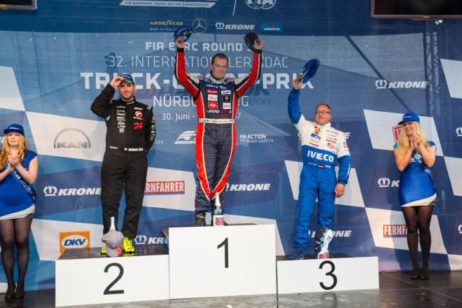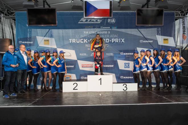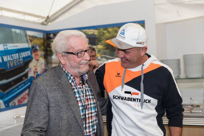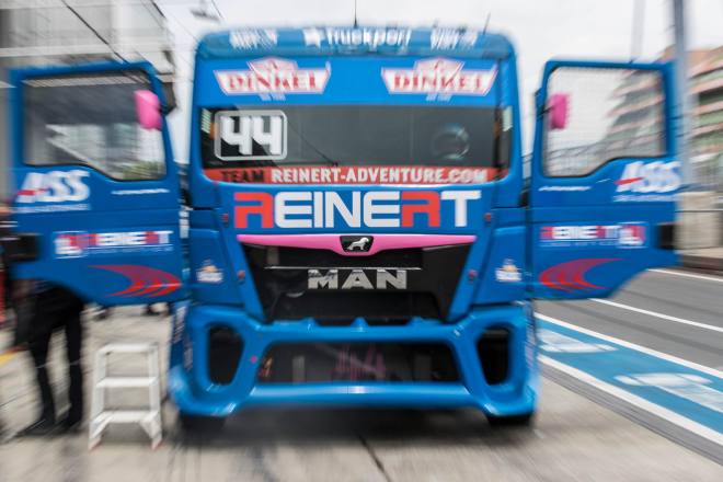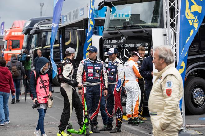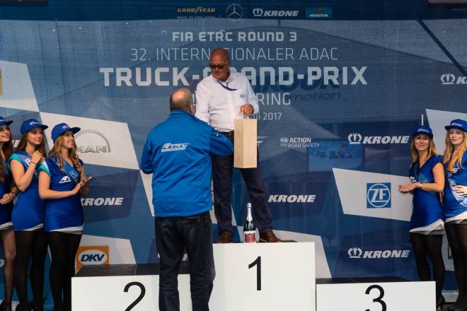 Im Gegensatz dazu stand nach den drei Championshiprennen der FIA-Starter immer derselbe Akteur ganz oben auf dem Siegertreppchen. Adam Lacko ließ es richtig krachen und dem Rest des Feldes nicht den Hauch einer Chance. Der Tscheche hat momentan offenbar einen guten Lauf. Nachdem er den Auftakt in Österreich einigermaßen „vergeigt“ hatte, präsentierte er sich schon in Misano in Topform, holte sich dort 58 von 60 möglichen Punkten und am Nürburgring 50 von 50 möglichen. Jochen Hahn und Steffi Halm – im Gesamtklassement die Verfolger von Spitzenreiter Lacko – bleiben deutlich hinter ihren Erwartungen zurück. Auch Norbert Kiss, am Sonntag Pole-Setter und Antonio Albacete, der diesmal viel Pech hatte, konnten Lacko nicht bremsen. Hahn schob sein „schlechtes“ Abschneiden (schlecht ist in diesem Zusammenhang relativ – andere Fahrer wären froh, Hahns Resultate einzufahren, aber für einen vierfachen Champion gelten eben andere Maßstäbe) auf das Wetter. Bei Regen sei sein neu aufgebauter Iveco sicher nicht das Maß der Dinge, erklärte der Schwarzwälder. Und der Dauerregen spielte auch bei Steffi Halm die entscheidende Rolle. Sie gibt freimütig zu, dass sie sich auf nasser Fahrbahn nicht besonders wohl fühlt, was ebenfalls relativ zu sehen ist: Die einzige Frau im Starterfeld mischt bei derartigen Verhältnissen dann eben nicht in den Top 3 mit, sondern steht als Siebte, Fünfte und Sechste in den Ergebnislisten. Gerd Körber ist immer noch in der "Findungsphase". Sein neuer Truck wurde ja von Jochen Jahn konzipiert, Körpers Team Schwabentruck und Hahn machten beim Bau der Fahrzeuge gemeinsame Sache. "Die Trucks von Jochen sind sicher super," sagte Körper, der in diesem Jahr e30 Jahre lang dabei ist und daher am Freitagabend mit einer Überraschungsparty gefeiert wurde. "Aber das Fahrwerk ist ganz anders, als ich das gewohnt bin. Manchmal fühle ich mich da noch richtig unsicher. Ich muss mich erst daran gewöhnen, das geht eben nicht nach einem oder zwei Rennen."