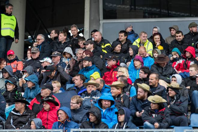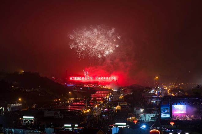 „Am Sonntag soll es besser werden. Steht so in meiner Wetter-App“: Der Satz war nach zweieinhalb verregneten Tagen of zu hören. Aber Wetter-Apps mögen andernorts funktionieren, das Wetter über dem Nürburgring hatte schon immer einen Hang zur Anarchie. Zuverlässige Voraussagen lassen sich da nur für die jeweils nächste Viertelstunde machen, den Eindruck hat man jedenfalls als Nicht-Eifelbewohner nach vielen Einsätzen beim Truck Grand Prix. Die beiden vergangenen Jahre mit jeweils Dauer-Sonnenschein muss man so gesehen als äußerst ungewöhnlich verbuchen, mehr oder weniger intensive Regenschauer unterschiedlicher Dauer sind ansonsten fester Bestandteil der Veranstaltung. Was in diesem Jahr dazu führte, dass sich das Feuerwerk größtenteils hinter den tieffliegenden Wolken abspielte. Die wurden aufs Feinste indirekt von hinten beleuchtet, aber von den funkelnden Sternen, Feuerschweifen und Pyro-Schauern bekamen die Besucher in der Müllenbachschleife wenig mit.