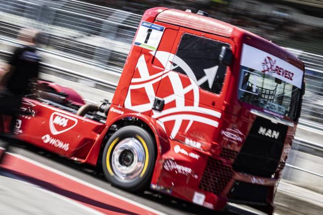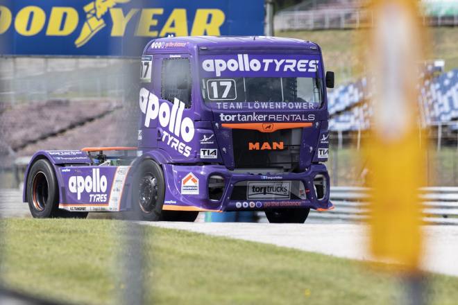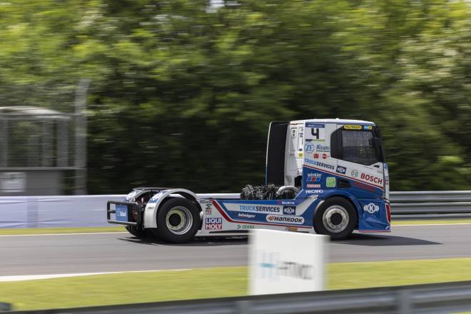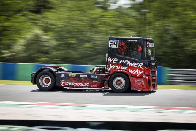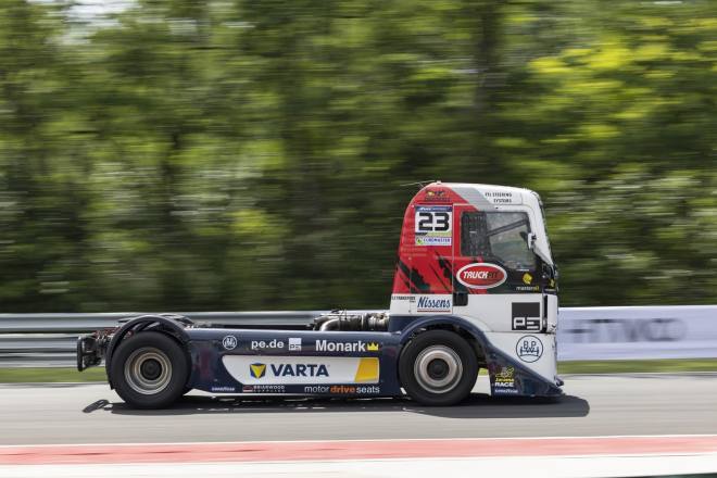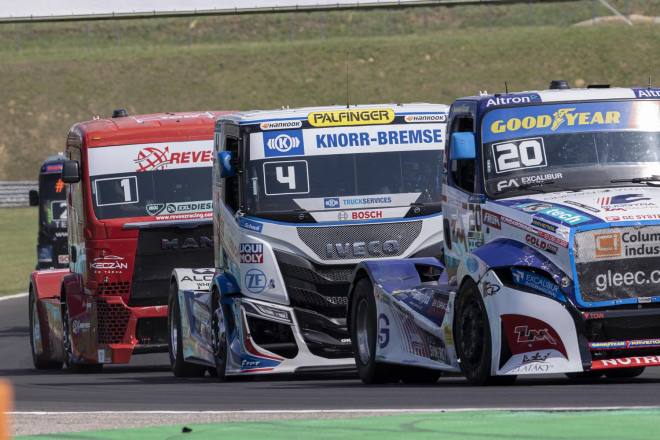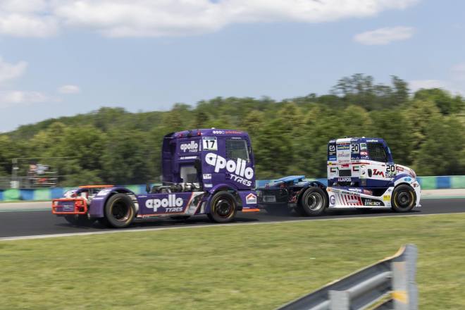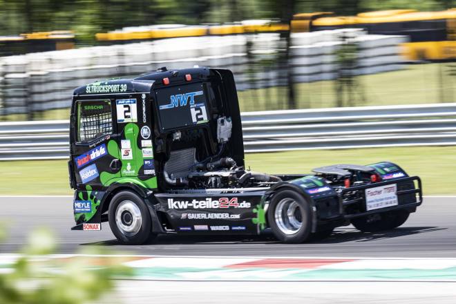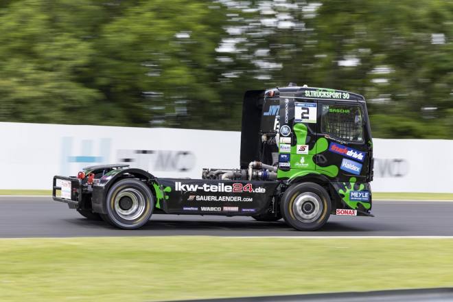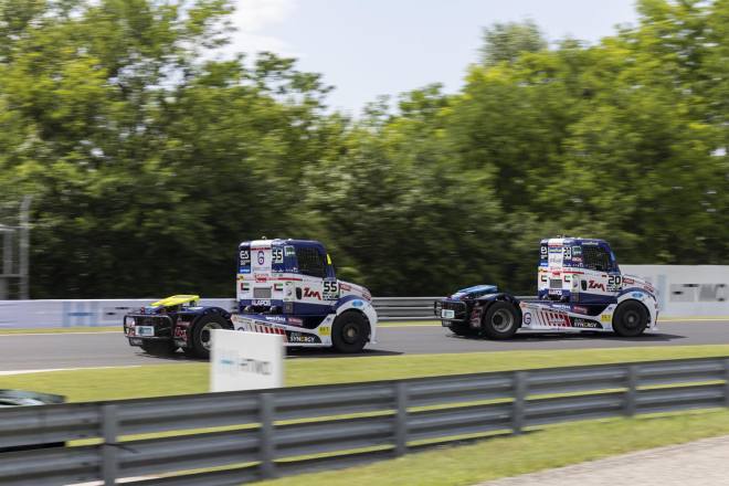 Am Sonntag standen alle Havaristen erneut am Start – die Mechanikerteams hatten ganze Arbeit geleistet und die Trucks in langer Nachtschicht wieder in einsatzbereiten Zustand versetzt. Nichts erinnerte mehr an den Crash, die Resultate fielen aus wie gewohnt oder zu erwarten: Gegen Norbi Kiss war auch über Nacht kein Kraut gewachsen. Rennen 3 gewann er mühelos von der Pole Position aus und beim Rennen 4 mit Reverse Grid zockte der Ungar seine sieben vor ihm gestarteten Konkurrenten in beeindruckender Manier ab. Hahn und Lacko durften den von der imposanten Fankulisse lautstark gefeierten Lokalmatador zweimal mit aufs Podium begleiten, sie tauschen dabei die Plätze: Zunächst wurde Lacko Zweiter, im finalen Rennen dann Hahn. Der Rekordchampion konnte mit drei Podestplätzen zwar einen Pokal mehr mit nach Hause nehmen als sein Landsmann Sascha Lenz. Doch dem Vizemeister dürfte der Pokal im Zweifelsfall egal sein – weil Hahn im Rennen 2 ohne Punkte blieb, schaufelte Lenz im direkten Vergleich sieben Zähler mehr auf sein Konto und avancierte damit im Gesamtklassement zum Verfolger von Spitzenreiter Kiss. Wobei man angesichts der aktuellen Kräfteverhältnisse wohl nicht von Verfolgung sprechen sollte. Lenz führt nach der zweiten Runde den Rest des Feldes an – das trifft es besser.