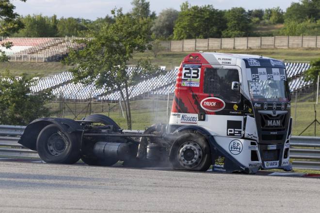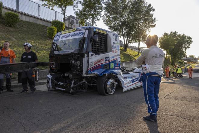 Zurück zu den Renntrucks: Die sorgten beim Start zu ihrem ersten Championshiprace am Samstag für die übliche motorsporttypische Geräuschkulisse. An der Spitze tauschten Jochen Hahn und Adam Lacko, Drittplatzierter des Qualifyings, während der Elf-Runden-Distanz die Plätze. Für Sascha Lenz sollte der zweite Platz das beste Resultat des Wochenendes bleiben. Im zweiten Rennen, dessen Start für 19.05 Uhr und damit ungewöhnlich spät angesetzt war, kam es dann zu einer Serie von Unfällen, die schon auf der Start- und Zielgeraden begann und sich bis nach der dritten Kurve hinzog. Norbert Kiss hatte Glück, dass sich bei seiner Havarie Jamie Anderson neben ihm befand: Nachdem Kiss‘ MAN in die Leitplanke gekracht und aufgestiegen war, stützte Andersons Truck bei der folgenden „Gegenbewegung“ den Havaristen ab, der sich sonst wohl überschlagen hätte. Nach diesem chaotischen Rennauftakt waren die Fahrzeuge von Jochen Hahn – er war von zwei Konkurrenten in die Zange genommen worden –, Antonio Albacete, Kiss und Anderson so schwer demoliert, dass sie zum Neustart nicht mehr antreten konnten. Wenig später verabschiedete sich auch Téo Calvet vorzeitig.