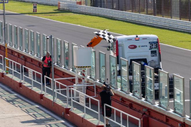 Kiss ging also als klarer Favorit in das Auftaktrennen des Jahres 2023, das wegen der nassen Piste unter Gelb gestartet wurde. Etwas überraschend schoss dann nach der dritten Runde Jochen Hahn im IVECO als Führender über den Zielstrich: Ein technischer Defekt hatte den Top-Favoriten zur vorzeitigen Aufgabe gezwungen, der Rekord-Europameister kam so zum ersten Sieg. Auf den Plätzen zwei Fahrer, die man dort nicht unbedingt erwartet hätte: Antonio Albacete und André Kursim. Sascha Lenz hatte sich im Qualifying verzockt und musste vom Ende des Feldes starten, mehr als Platz fünf war für den Plaidter dann nicht mehr zu holen. Vor ihm kam der jüngste Spross der portugiesischen Truckrace-Familie Rodrigues ins Ziel: Opa Eduardo und Vater Jose applaudierten Jose Eduardo, der es richtig krachen ließ in Misano. Am Sonntag kam der Youngster in Race vier sogar als Zweiter ins Ziel, in der Gesamtwertung liegt er nach dem ersten von acht Wochenenden auf Rang 5.