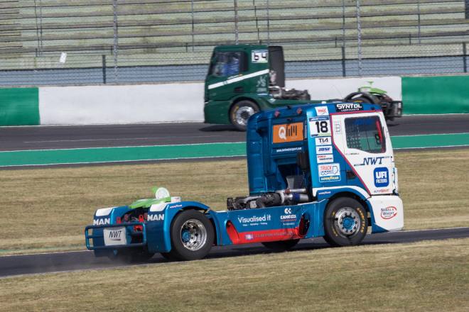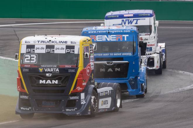 Ein Durchmarsch wie noch in Misano wurde es dann aber doch nicht. Im zweiten Championshiprace setzte sich Lokalmatador René Reinert durch – wobei das ja auch zu einem Teil das Verdienst von Kiss und seinem Revesz-Team ist. Reinert hatte in der Winterpause den alten Kiss-Truck als Gebrauchtfahrzeug erworben und fährt damit deutlich andere Ergebnisse ein als in früheren Jahren. Es kommt also nicht nur auf die fahrerischen Qualitäten, sondern auch auf das Material an. Mit Reinert auf dem Podium: Mark Taylor, der als Führender ins Rennen gegangen war und später seinen zweiten Platz zäh verteidigt hatte, sowie Sascha Lenz als Drittplatzierter.
