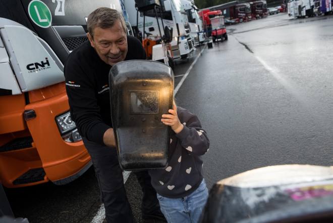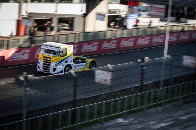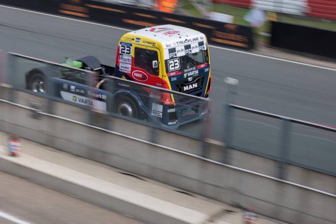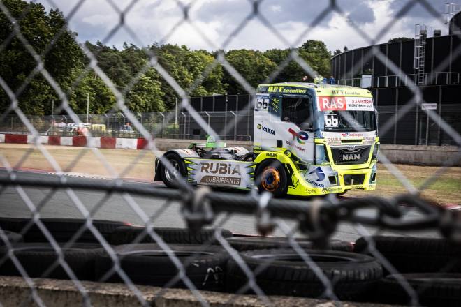 Um es vorwegzunehmen: Es blieb bei zwei Siegen, einem dritten Platz und einem Malheur im zweiten Championshiprace, bei dem Antonio Albacete in seinem 901. Rennen ohne eigenes Zutun arg in Mitleidenschaft gezogen wurde. Der Spanier war genau an der falschen Stelle, als sich in der vorletzten Runde Kiss und Steffi Halm beharkten. In der Folge drehte sich der rote MAN mit der Startnummer 1 und krachte in Albacetes Truck, der daraufhin in die Boxenmauer geschleudert wurde und nach dem Ausrollen auf der Start- und Zielgeraden liegen blieb. Das Rennen wurde unmittelbar nach dem Crash abgebrochen. Trostpreis für Albacete: Da Kiss und Halm im Nachgang von den Stewards jeweils eine Zeitstrafe von 5 Sekunden aufgebrummt bekamen, rückte der Spanier in der finalen Ergebnisliste auf den dritten Platz vor. Jochen Hahn kam in diesem turbulenten Lauf zu seinem ersten Saisonsieg. Ein schöner Erfolg für den Altensteiger, doch auch dieser Triumph wird wohl nichts daran ändern, dass Kiss am Ende der Saison als Rekord-Europameister dastehen wird: Hahn hat inzwischen 77 Punkte Rückstand auf seinen Rivalen, der sich damit sogar ein Wochenende mit null Punkten leisten könnte und trotzdem Spitzenreiter bliebe. Viel wahrscheinlicher ist allerdings, dass Kiss seinen nächsten Triumph bereits am kommenden Wochenende in Le Mans feiern kann.