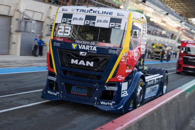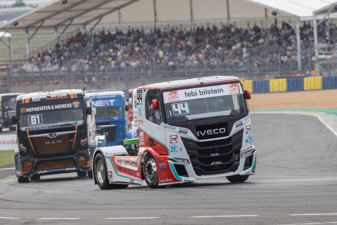 Interessant bleibt der Blick auf die Ergebnislisten der Renen 2 und 4 sowie der Chrome Class. An den beiden letzten Wochenenden hat sich René Reinert zum Spezialisten für die Wertungsläufe mit reverse gridgemausert, auch in Le Mans gingen zwei Siege auf sein Konto. Und in der Chrome Class geht es unverändert munter zur Sache, hier hat sich Clemens Hecker mit seinem immer noch exotischen Scania nach einem Ausfall im ersten Lauf in der Spitze festgebissen. Zwei Siege am Sonntag sorgten für viele Punkte, so dass sich der Scania-Fan aus Westfalen vor dem finalen Aufeinandertreffen den Spitzenplatz in der Gesamtwertung mit dem Briten Bradley Smith teilt, der wiederum den gelben Iveco von Don’t Touch Racing pilotiert.