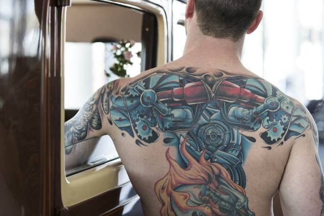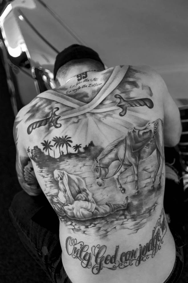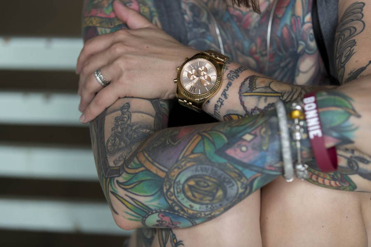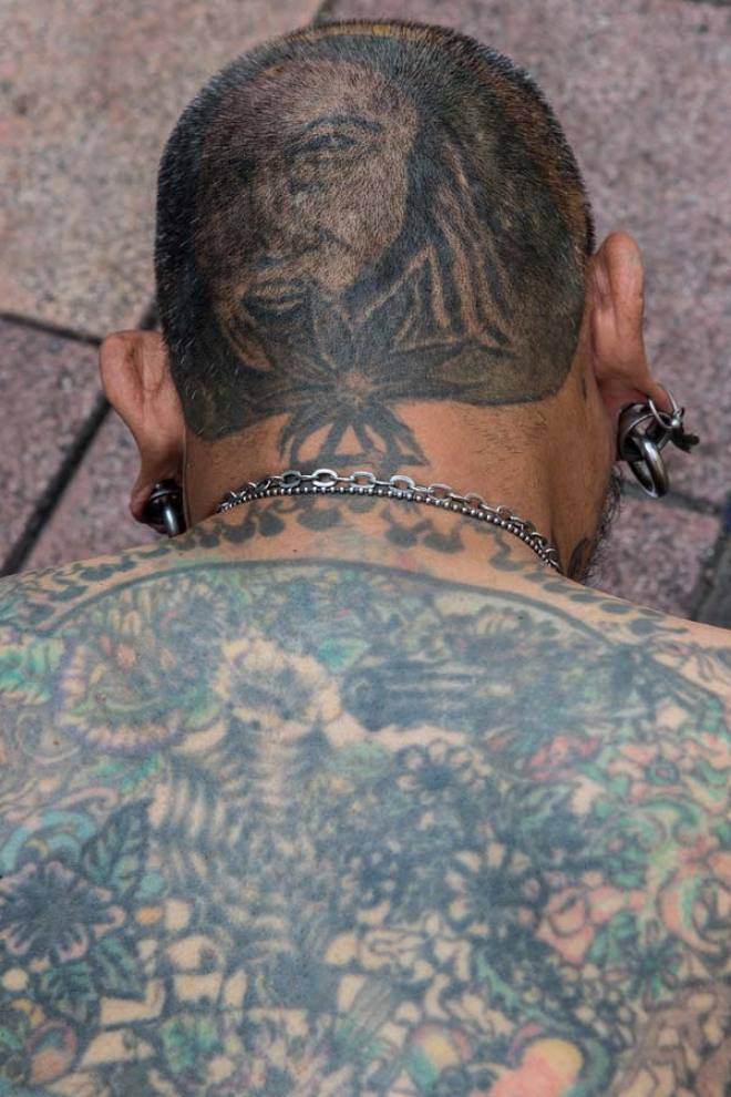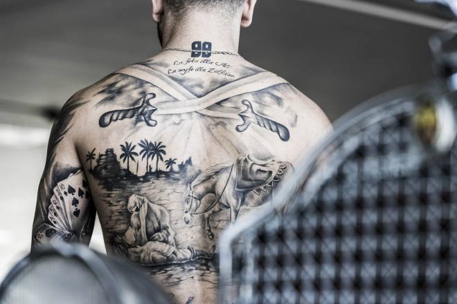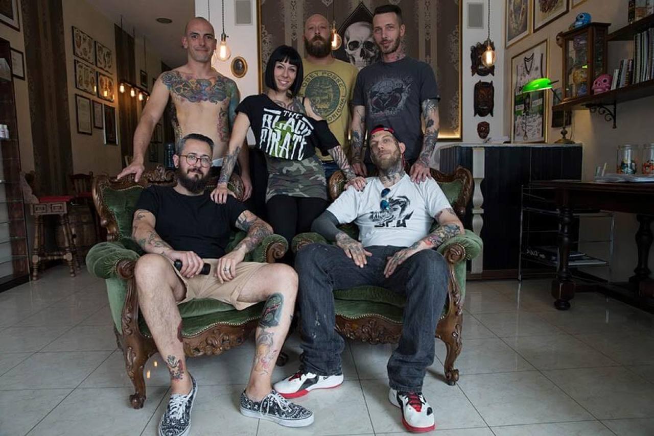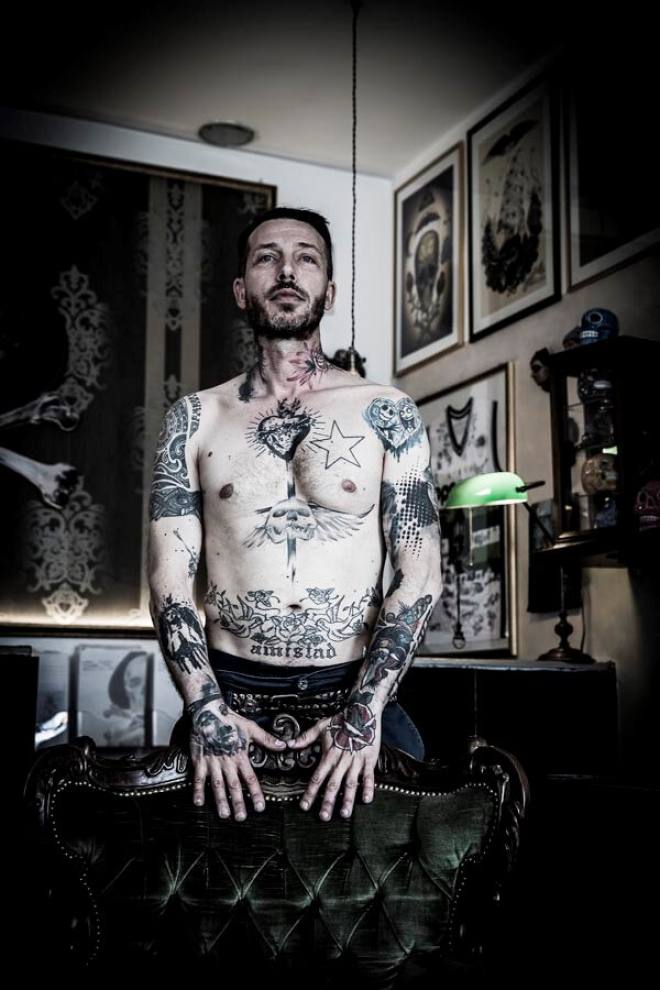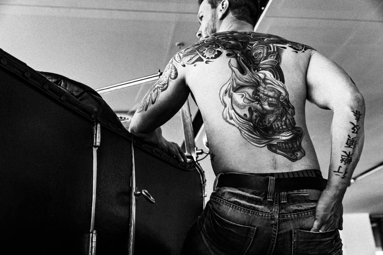 Früher hatten Tätowierungen zumindest in unserem Kulturkreis den Hautgout des Unnormalen, allenfalls am Rande der Gesellschaft Üblichen. Seeleute, sagte man, ließen sich tätowieren, Kiezgrößen, Menschen vom unteren Rand der Gesellschaft und nicht zuletzt "Knastbrüder". Das hat sich inzwischen gründlich geändert, Tattoos gelten als allgemein akzeptierter Körperschmuck, der je nach persönlichem Geschmack mit Stolz zur Schau getragen oder diskret unter der Kleidung versteckt wird. Wenn die Leidenschaft für diese Art der Körperumgestaltung allerdings soweit geht, dass kaum mehr ein Fleck Haut ohne Bild, Text oder Ornament zu finden ist, löst das immer noch Befremden aus - nur wenige Leute bringen für diese Sucht nach Tattoos Verständnis auf. Ich selbst komme (bisher) gut ohne Tattoos aus, trotzdem war ich fasziniert, als ich über meinen Freund Claudio in Italien seine Clique kennenlernen durfte, die sich bei Tania im Studio Black Pirate in Misano-Adriatico regelmäßig neue Bilder stechen lässt - sofern sich dafür noch ein Platz findet. Weitere Fototermine in dieser Szene sind geplant! Übrigens: Wer Lust auf Qualitätsarbeit mit Ewigkeitsgarantie hat, kann sich hier zum Kunst-Stechen anmelden www.blackpirate.it